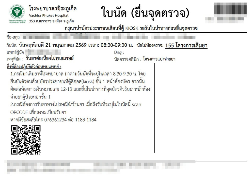 ตัวอย่างใบนัดที่มี QR Code เพื่อลงทะเบียนโครงการเติมยา