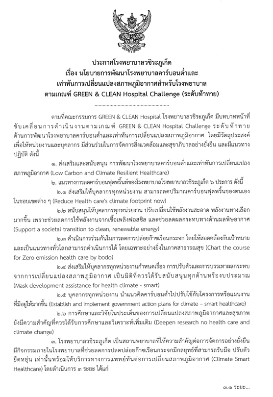 นโยบายการพัฒนาโรงพยาบาลคาร์บอนต่ำและ เท่าทันการเปลี่ยนแปลงสภาพภูมิอากาศสำหรับโรงพยาบาล ตามเกณฑ์ GREEN & CLEAN Hospital Challenge (ระดับท้าทาย) Vachira Phuket2026-01-27T16:44:50+07:0027 มกราคม 2026|Categories: ประกาศ-นโยบาย| ปรับปรุงเมื่อ 5 ชั่วโมง ago เอกสารแนบ # File Date added File size Downloads 1 นโยบายรพ.คาร์บอนต่ำ 27 มกราคม 2026 16:43 น. 2 MB 3 เข้าชม: 18 ลิงค์สำหรับนำไปเผยแพร่: https://www.vachiraphuket.go.th/links/5paw แบ่งปันเรื่องนี้ FacebookXTelegramEmail