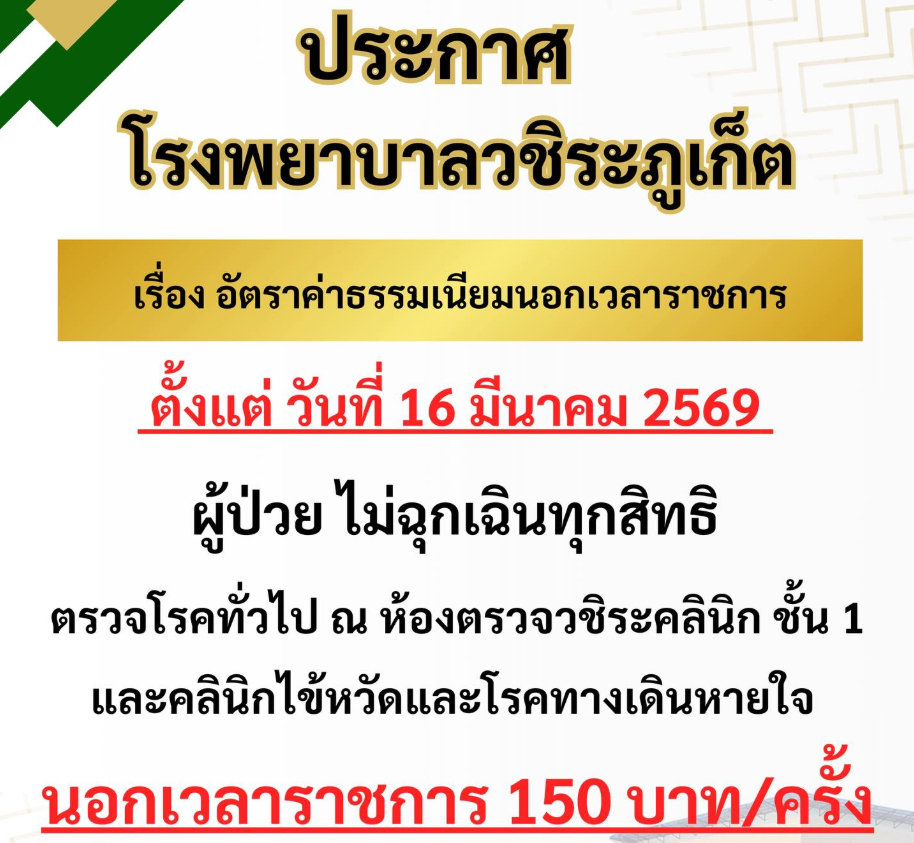 ประกาศเรื่อง อัตราค่าธรรมเนียมนอกเวลาราชการตรวจโรคทั่วไป ห้องตรวจวชิระคลินิก ชั้น 1 และคลินิกไข้หวัดและโรคทางเดินหายใจ จากเดิม 100 บาท เป็น 150 บาท ตั้งแต่วันที่ 16[...]