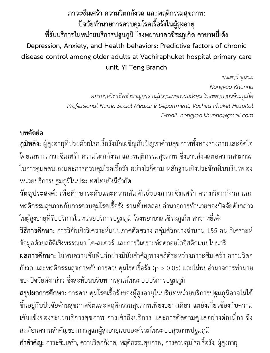 ภาวะซึมเศร้า ความวิตกกังวล และพฤติกรรมสุขภาพ: ปัจจัยทำนายการควบคุมโรคเรื้อรังในผู้สูงอายุ ที่รับบริการในหน่วยบริการปฐมภูมิ โรงพยาบาลวชิระภูเก็ต สาขาหยี่เต้ง Vachira Phuket2026-01-26T11:54:03+07:0026 มกราคม 2026|Categories: งานวิจัย/ผลงานทางวิชาการ| View Larger Image ปรับปรุงเมื่อ 23 ชั่วโมง ago เอกสารแนบ # File Date added File size Downloads 1 ภาวะซึมเศร้า ความวิตกกังวล และพฤติกรรมสุข 26 มกราคม 2026 11:53 น. 291 KB 3 2 แบบฟอร์มขอเผยแพร่ฯ 26 มกราคม 2026 11:53 น. 758 KB 5 เข้าชม: 17 ลิงค์สำหรับนำไปเผยแพร่: https://www.vachiraphuket.go.th/links/j1s3 แบ่งปันเรื่องนี้ FacebookXTelegramEmail