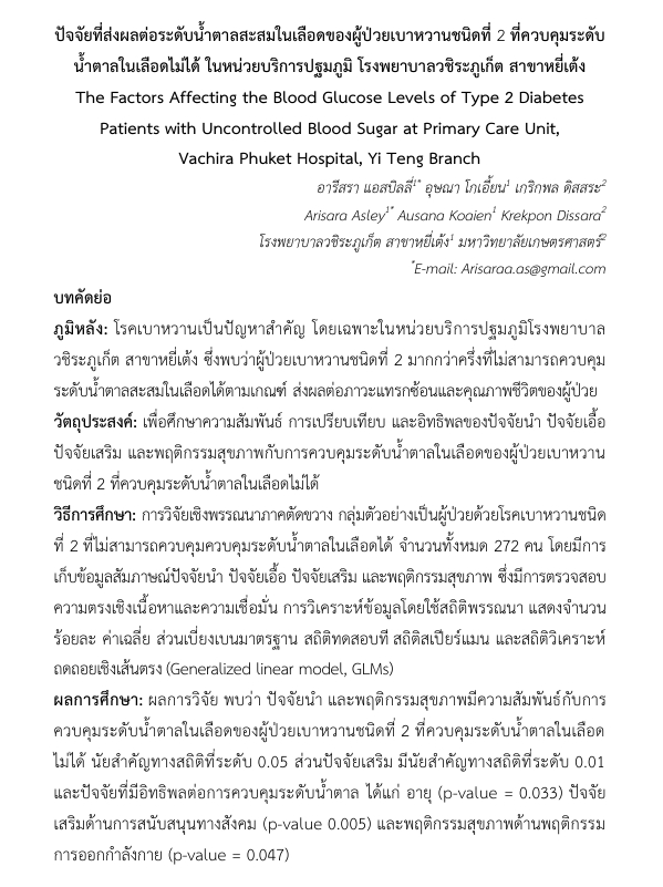 ปัจจัยที่ส่งผลต่อระดับน้ำตาลสะสมในเลือดของผู้ป่วยเบาหวานชนิดที่ 2 ที่ควบคุมระดับ น้ำตาลในเลือดไม่ได้ ในหน่วยบริการปฐมภูมิ โรงพยาบาลวชิระภูเก็ต สาขาหยี่เต้ง Vachira Phuket2026-02-05T17:00:56+07:005 กุมภาพันธ์ 2026|Categories: งานวิจัย/ผลงานทางวิชาการ| ปรับปรุงเมื่อ 12 ชั่วโมง ago เอกสารแนบ # File Date added File size Downloads 1 แบบฟอร์มขอเผยแพร่ฯ 5 กุมภาพันธ์ 2026 16:45 น. 916 KB 1 2 ปัจจัยที่ส่งผลต่อระดับน้ำตาลสะสมในเลือดarisara 5 กุมภาพันธ์ 2026 16:45 น. 344 KB 3 เข้าชม: 17 ลิงค์สำหรับนำไปเผยแพร่: https://www.vachiraphuket.go.th/links/2m5c แบ่งปันเรื่องนี้ FacebookXTelegramEmail