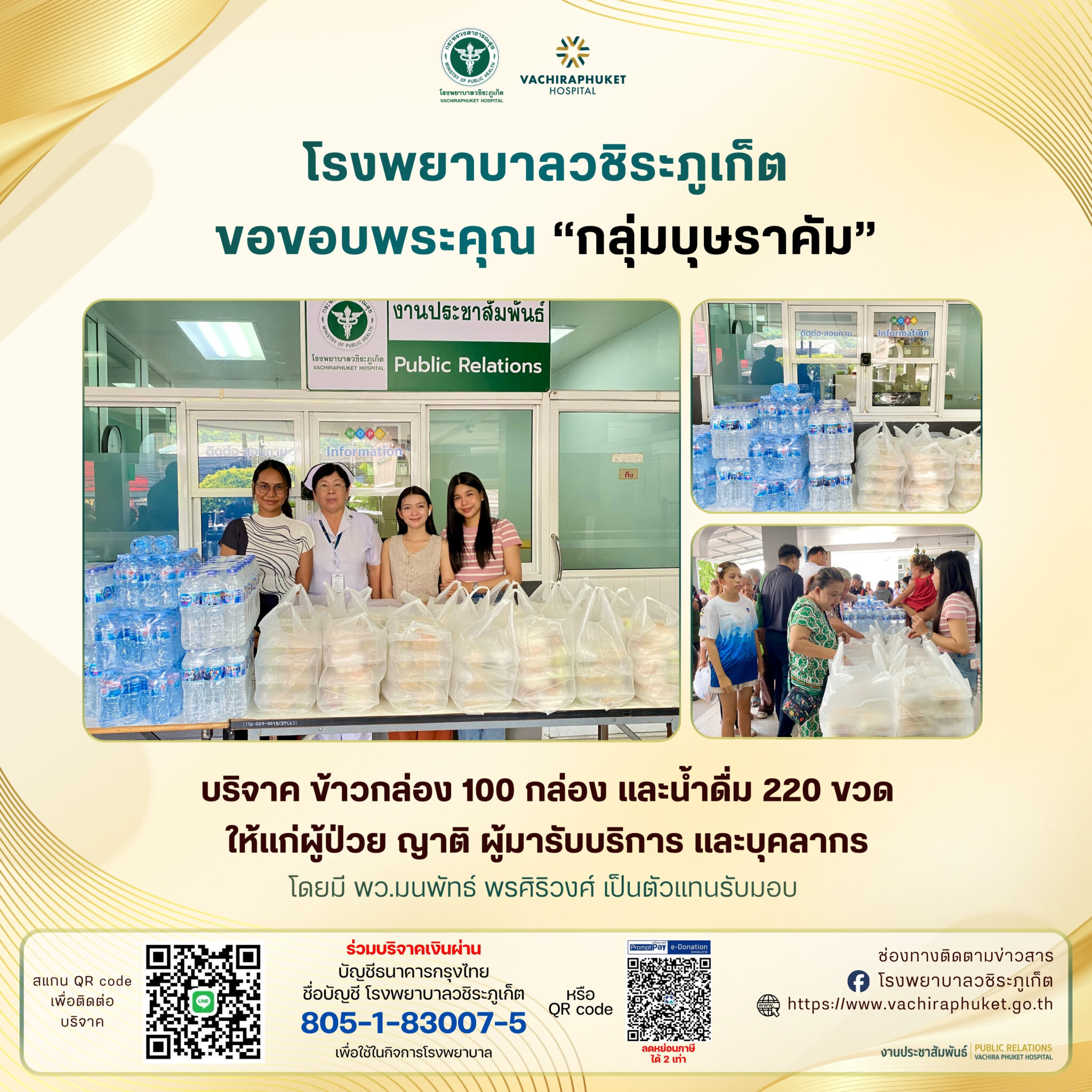กลุ่มบุษราคัม บริจาคข้าวกล่อง 100 กล่อง และน้ำดื่ม 220 ขวด ให้กับ รพ.วชิระภูเก็ต อภิญญา เอ่งฉ้วน2026-04-21T14:17:40+07:0021 เมษายน 2026|Categories: ข่าวบริจาค|Tags: บริจาค| View Larger Image ปรับปรุงเมื่อ 3 ชั่วโมง ago เข้าชม: 41 ลิงค์สำหรับนำไปเผยแพร่: https://www.vachiraphuket.go.th/go/v52 แบ่งปันเรื่องนี้ FacebookXTelegramEmail