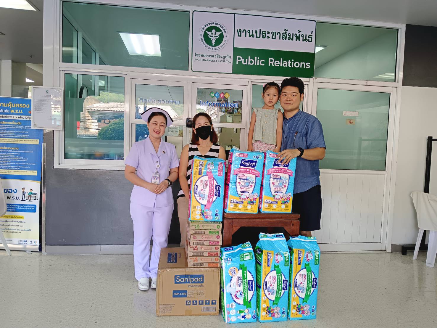 6 เม.ย. 2569 คุณกิตติพันธ์ คุณอัญญ์ชิสา วานิช และคุณณัฐหทัย จิระวุธานันท์ บริจาคผ้าอ้อมผู้ใหญ่ 6 แพ็ค แผ่นรองซับ 1 ลัง และนมเปรี้ยว 4 ลัง ให้กับโรงพยาบาลวชิระภูเก็ต โดยมี พว.บงกช นุ้ยสินธุ์