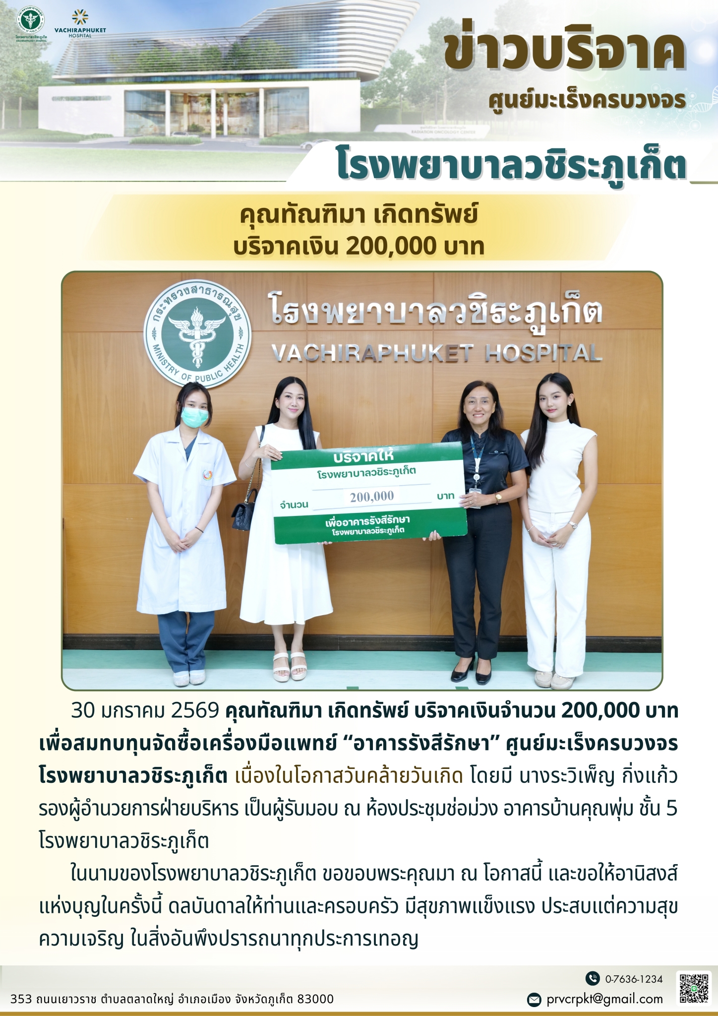 คุณทัณฑิมา เกิดทรัพย์ บริจาคเงินจำนวน 200,000 บาท เพื่อสมทบทุนจัดซื้อเครื่องมือแพทย์ “อาคารรังสีรักษา” ศูนย์มะเร็งครบวงจร โรงพยาบาลวชิระภูเก็ต เนื่องในวันคล้ายวันเกิด อภิญญา เอ่งฉ้วน2026-01-30T15:41:59+07:0030 มกราคม 2026|Categories: ข่าวบริจาค|Tags: รังสีรักษา| View Larger Image ปรับปรุงเมื่อ 2 ชั่วโมง ago เข้าชม: 17 ลิงค์สำหรับนำไปเผยแพร่: https://www.vachiraphuket.go.th/links/jkx7 แบ่งปันเรื่องนี้ FacebookXTelegramEmail