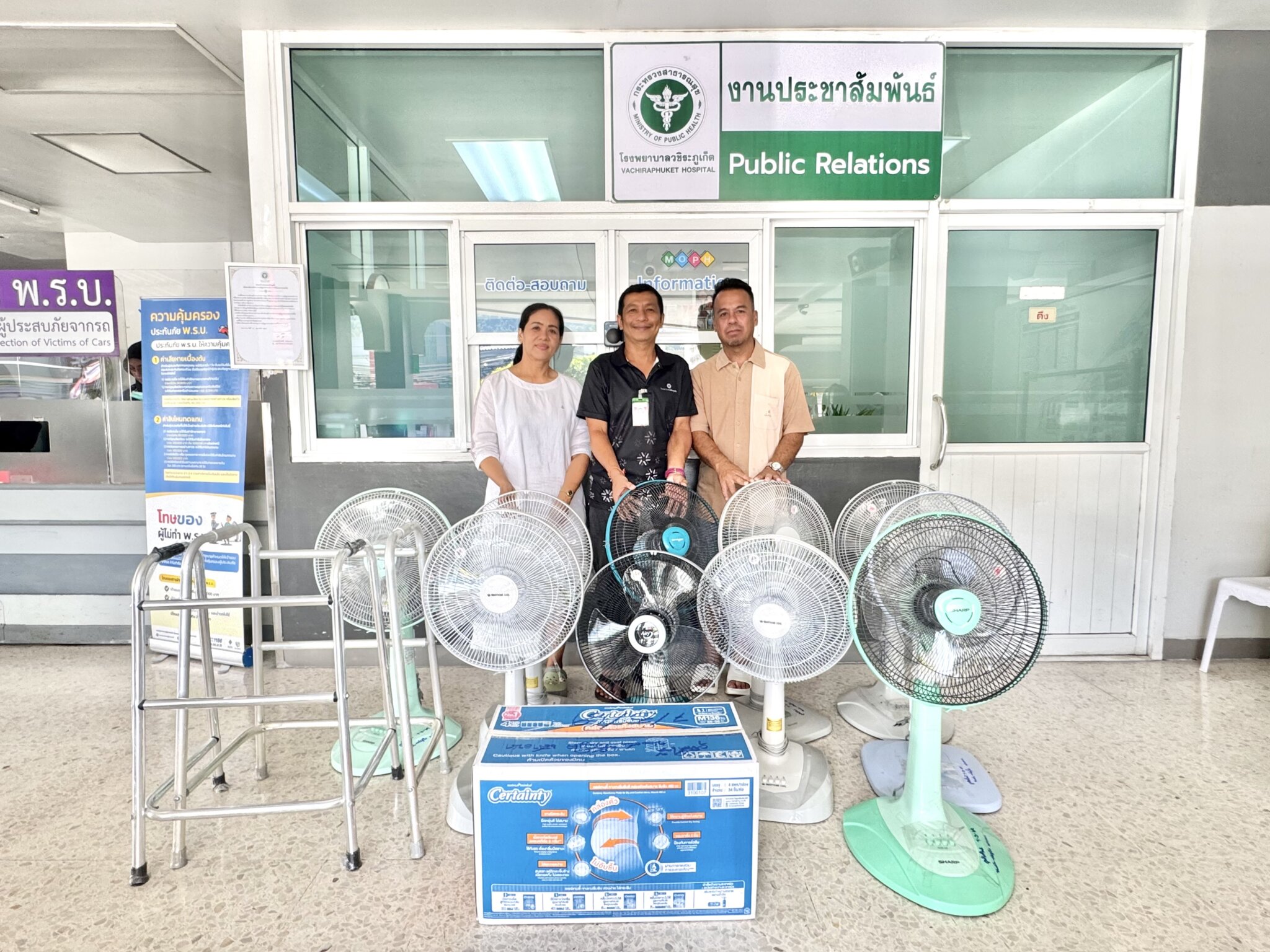 29 มีนาคม 2569 คุณนพดล แซ่อ๋อง และครอบครัว บริจาคพัดลมจำนวน 10 ตัว วอร์คเกอร์ 4 ขา 2 อัน และแพมเพิส 1 ลัง ให้กับโรงพยาบาลวชิระภูเก็ต และเพื่ออุทิศให้แก่นางสาวขวัญใจ เสวนา โดยมี นายสุรชัย ชูจิตต์ เวรตรวจการกลุ่มภารกิจด้านอำนวยการ เป็นตัวแทนรับมอบ ณ อาคารผู้ป่วยนอกชั้น 1 โรงพยาบาลวชิระภูเก็ต
