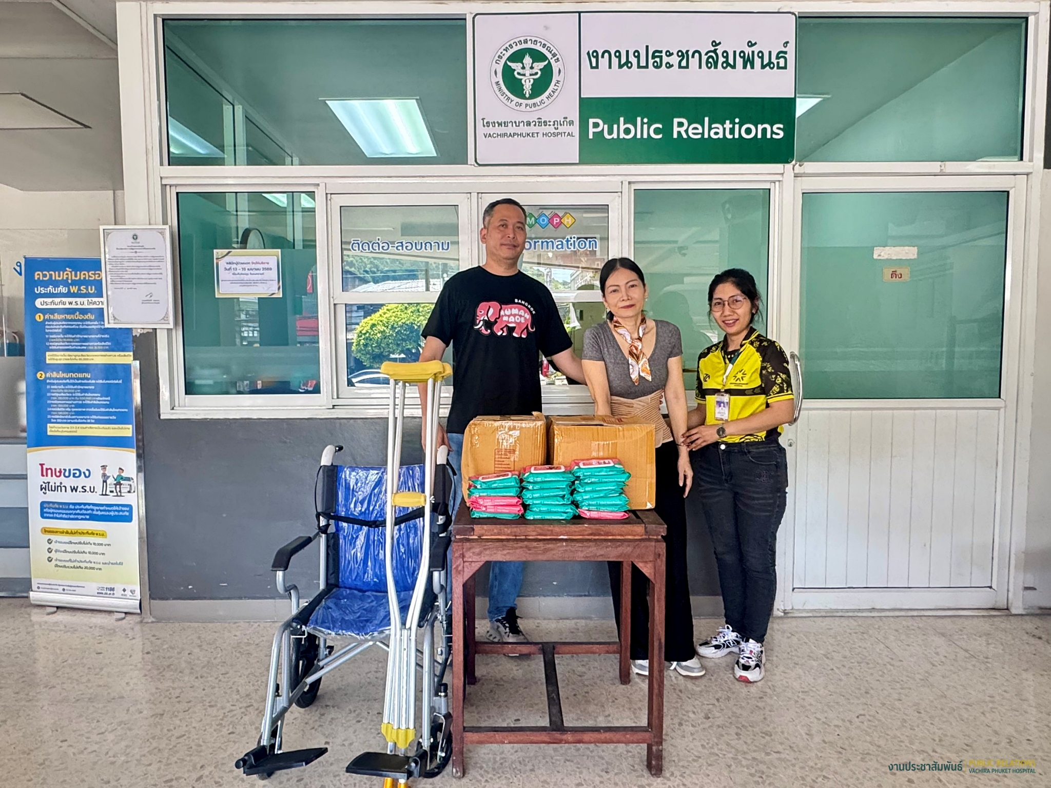 12 เมษายน 2569 คุณนรินทร์ – คุณศรัณยภัทร เรืองเดชาวิวัฒน์ บริจาคทิชชู่เปียก 110 ห่อ รถเข็นผู้ป่วย และไม้ค้ำยัน ให้กับโรงพยาบาลวชิระภูเก็ต โดยมี คุณวรรณกร ชรอยนุช เวรตรวจการกลุ่มภารกิจด้านอำนวยการ เป็นตัวแทนรับมอบ ณ อาคารผู้ป่วยนอกชั้น 1 โรงพยาบาลวชิระภูเก็ต