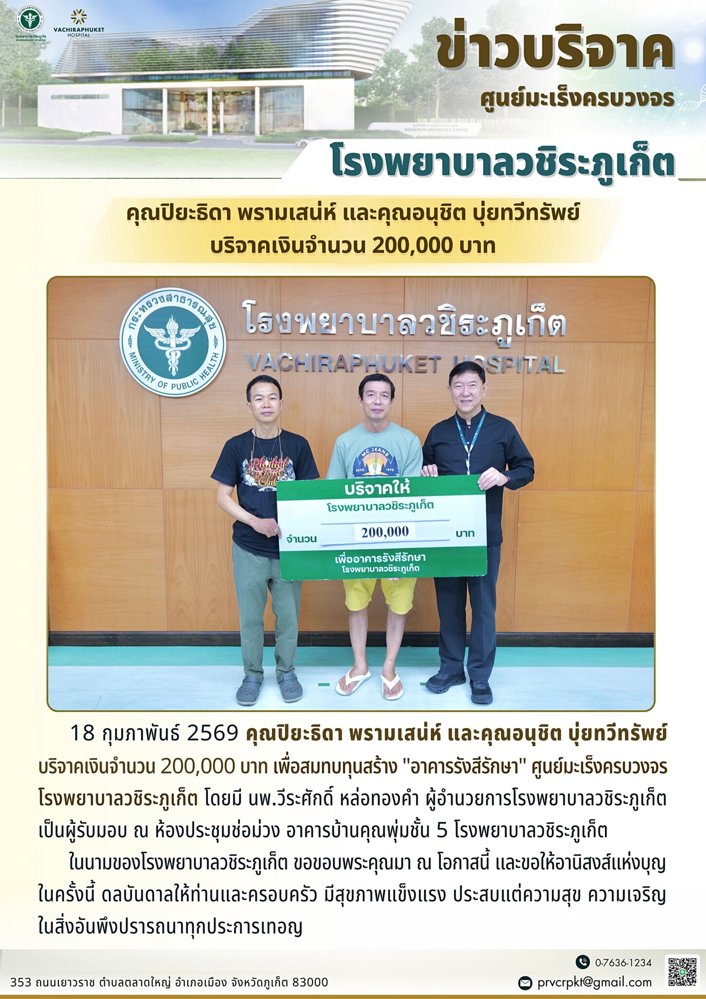 คุณปิยะธิดา พรามเสน่ห์ และคุณอนุชิต บุ่ยทวีทรัพย์ บริจาคเงินจำนวน 200,000 บาท เพื่อสมทบทุนจัดซื้อเครื่องมือแพทย์ “อาคารรังสีรักษา” ศูนย์มะเร็งครบวงจร โรงพยาบาลวชิระภูเก็ต อภิญญา เอ่งฉ้วน2026-02-18T14:09:51+07:0018 กุมภาพันธ์ 2026|Categories: ข่าวบริจาค|Tags: รังสีรักษา| View Larger Image ปรับปรุงเมื่อ 3 ชั่วโมง ago เข้าชม: 21 ลิงค์สำหรับนำไปเผยแพร่: https://www.vachiraphuket.go.th/links/9ax4 แบ่งปันเรื่องนี้ FacebookXTelegramEmail