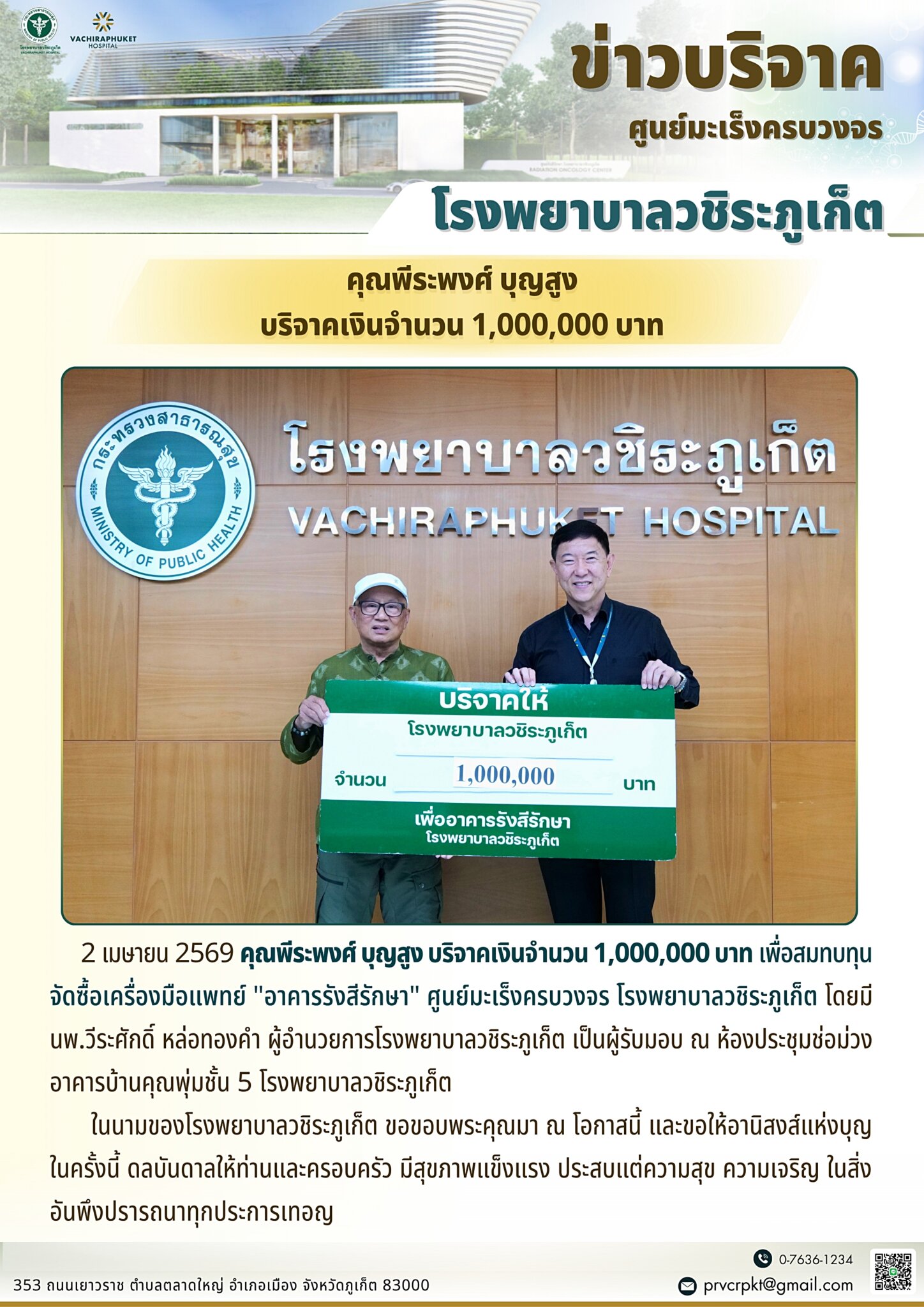 คุณพีระพงศ์ บุญสูง บริจาคเงินจำนวน 1,000,000 บาท เพื่อสมทบทุน จัดซื้อเครื่องมือแพทย์ “อาคารรังสีรักษา” ศูนย์มะเร็งครบวงจร โรงพยาบาลวชิระภูเก็ต อภิญญา เอ่งฉ้วน2026-04-02T20:42:37+07:002 เมษายน 2026|Categories: ข่าวบริจาค|Tags: รังสีรักษา| View Larger Image ปรับปรุงเมื่อ 2 ชั่วโมง ago เข้าชม: 3 ลิงค์สำหรับนำไปเผยแพร่: https://www.vachiraphuket.go.th/go/0pon แบ่งปันเรื่องนี้ FacebookXTelegramEmail