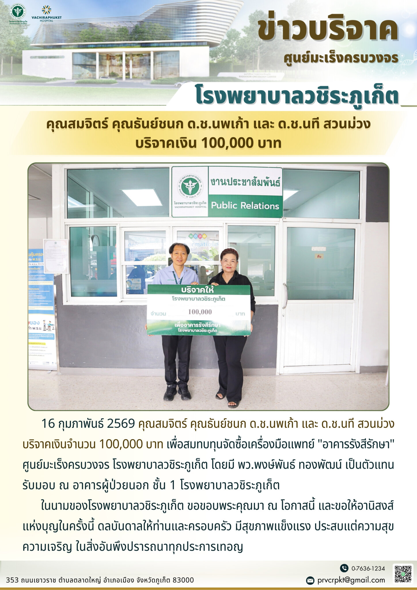 คุณสมจิตร์ คุณธันย์ชนก ด.ช.นพเก้า และ ด.ช.นที สวนม่วง บริจาคเงินจำนวน 100,000 บาท เพื่อสมทบทุนจัดซื้อเครื่องมือแพทย์ “อาคารรังสีรักษา” ศูนย์มะเร็งครบวงจร โรงพยาบาลวชิระภูเก็ต ดารัตน์ ภิญโญ2026-02-16T13:56:00+07:0016 กุมภาพันธ์ 2026|Categories: ข่าวบริจาค|Tags: รังสีรักษา| View Larger Image ปรับปรุงเมื่อ 8 ชั่วโมง ago เข้าชม: 91 ลิงค์สำหรับนำไปเผยแพร่: https://www.vachiraphuket.go.th/guvi แบ่งปันเรื่องนี้ FacebookXTelegramEmail
