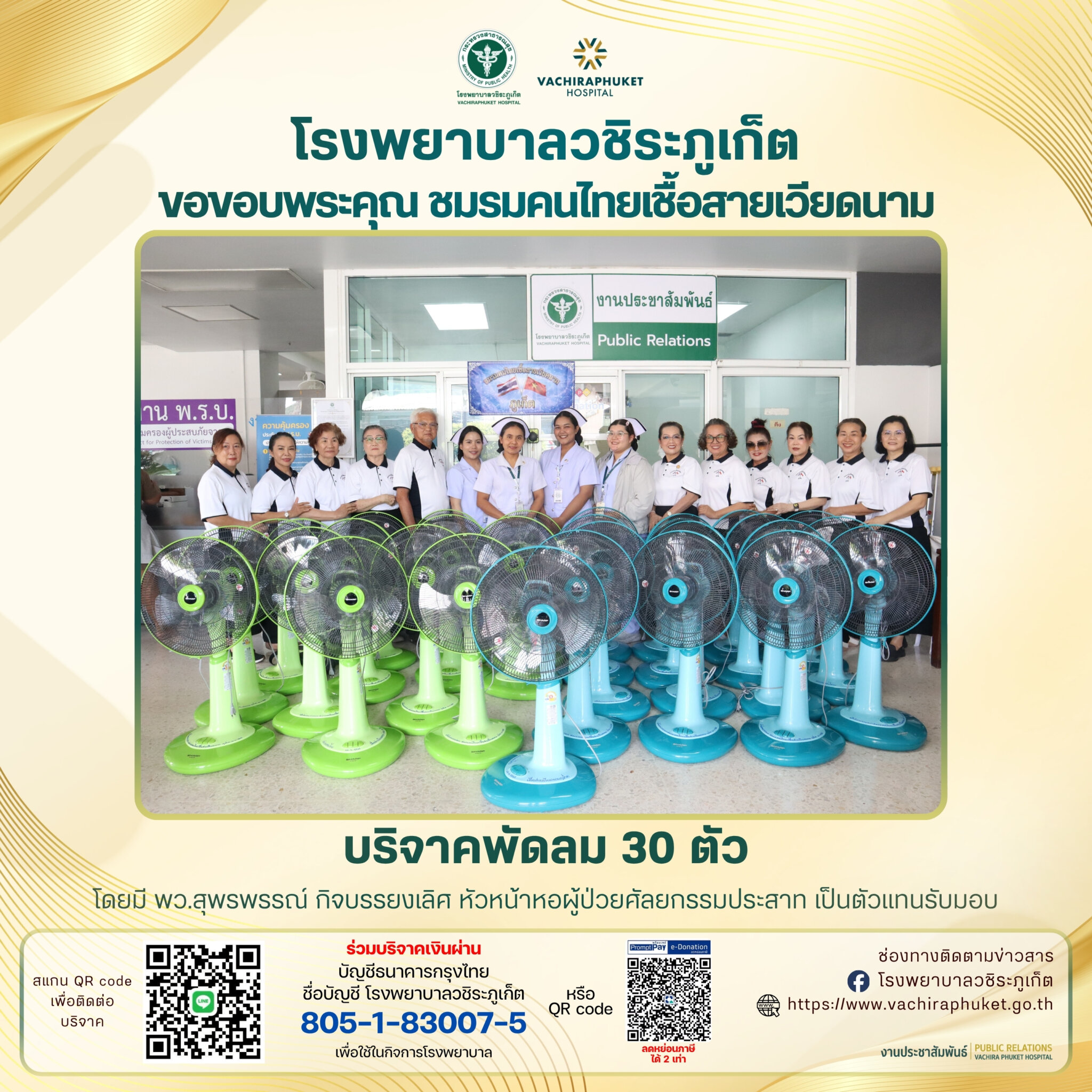 ชมรมคนไทยเชื้อสายเวียดนาม บริจาคพัดลม 30 ตัว ให้กับ รพ. วชิระภูเก็ต อภิญญา เอ่งฉ้วน2026-04-16T14:35:43+07:0016 เมษายน 2026|Categories: ข่าวบริจาค| View Larger Image ปรับปรุงเมื่อ 6 ชั่วโมง ago เข้าชม: 9 ลิงค์สำหรับนำไปเผยแพร่: https://www.vachiraphuket.go.th/3moz แบ่งปันเรื่องนี้ FacebookXTelegramEmail