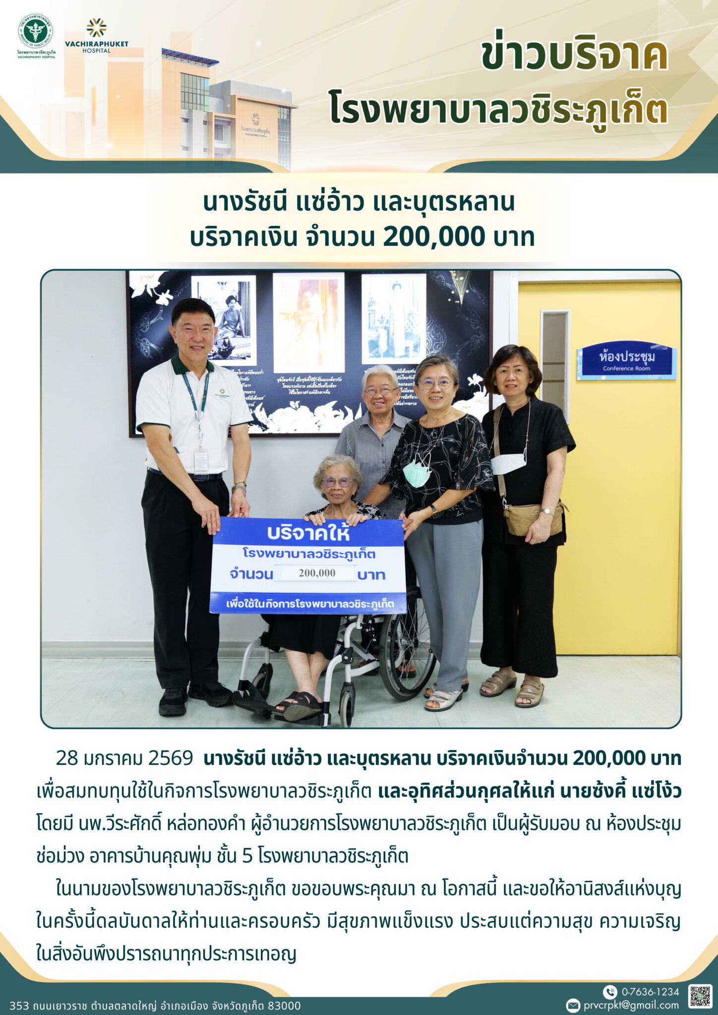 นางรัชนี แซ่อ้าว และบุตรหลาน บริจาคเงินจำนวน 200,000 บาท เพื่อสมทบทุนใช้ในกิจการโรงพยาบาลวชิระภูเก็ต และอุทิศส่วนกุศลให้แก่ นายซ้งคี้ แซ่โง้ว