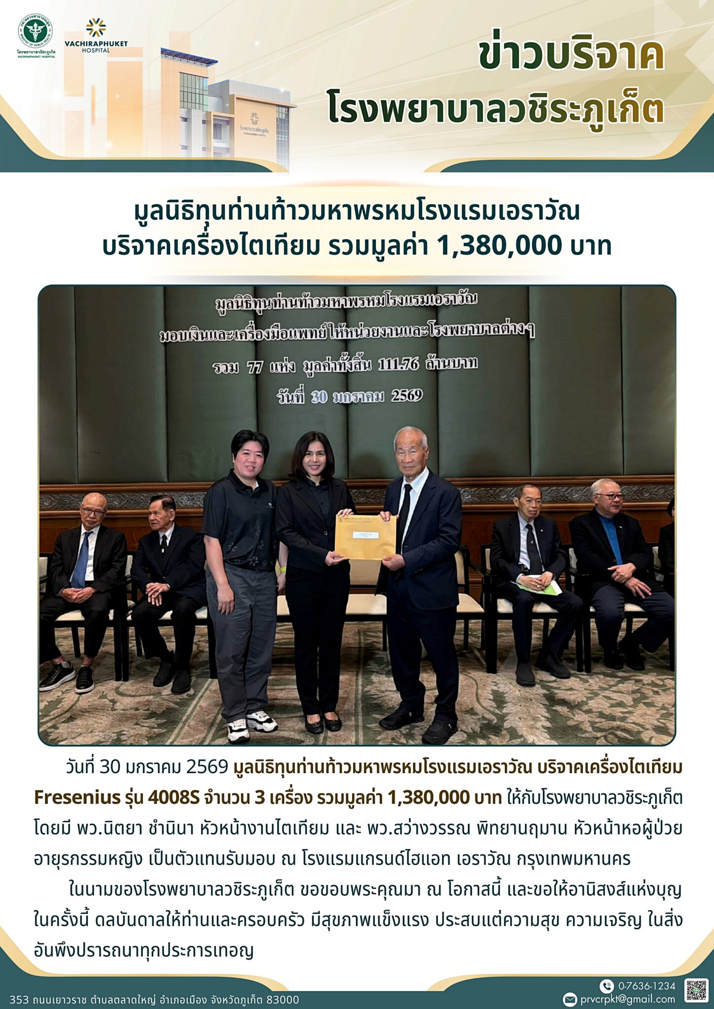 มูลนิธิทุนท่านท้าวมหาพรหมโรงแรมเอราวัณ บริจาคเครื่องไตเทียม Fresenius รุ่น 4008S จำนวน 3 เครื่อง รวมมูลค่า 1,380,000 บาท ให้กับโรงพยาบาลวชิระภูเก็ต อภิญญา เอ่งฉ้วน2026-02-02T20:55:13+07:002 กุมภาพันธ์ 2026|Categories: ข่าวบริจาค| View Larger Image ปรับปรุงเมื่อ 22 ชั่วโมง ago เข้าชม: 94 ลิงค์สำหรับนำไปเผยแพร่: https://www.vachiraphuket.go.th/zbpi แบ่งปันเรื่องนี้ FacebookXTelegramEmail