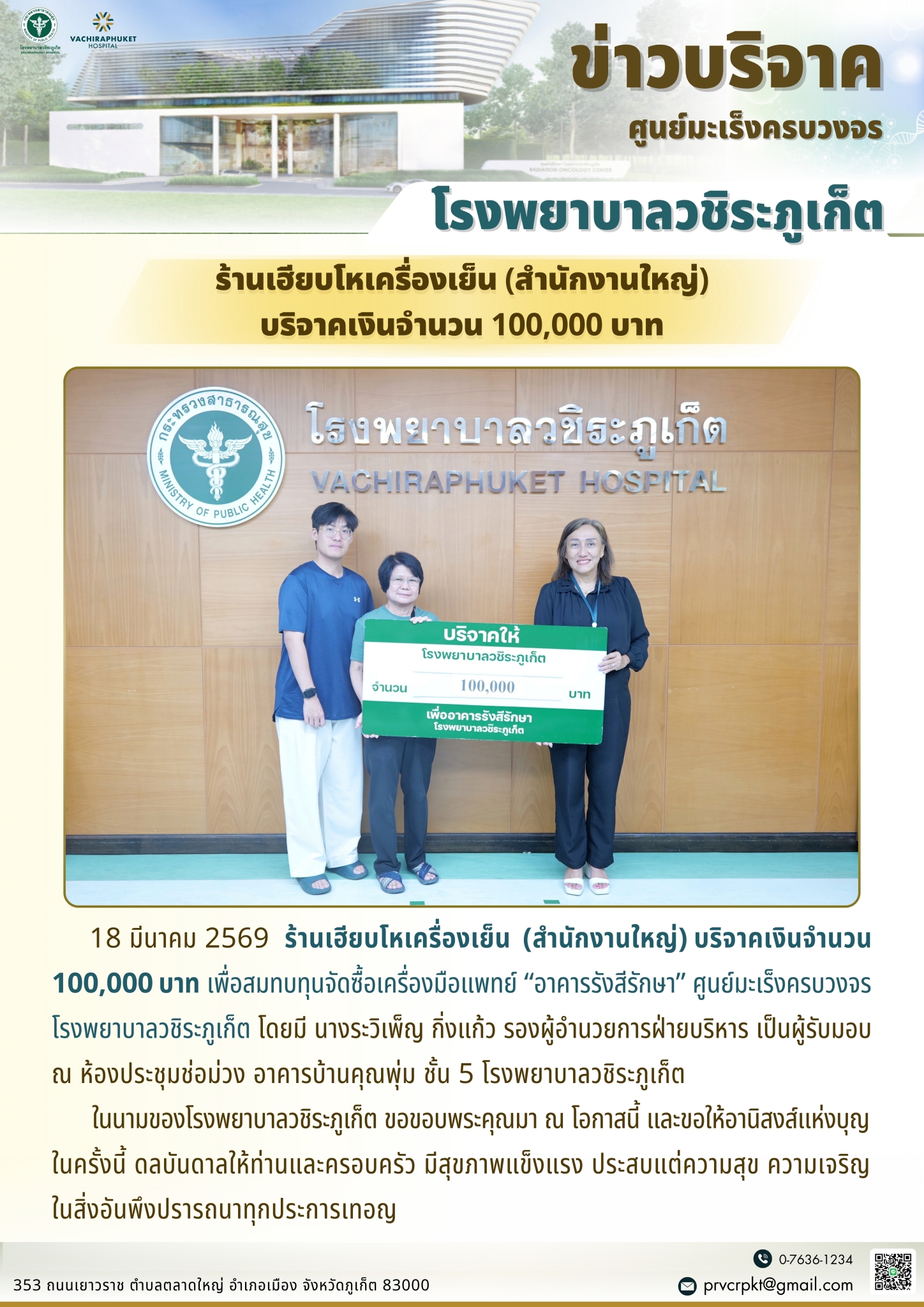 ร้านเฮียบโหเครื่องเย็น (สำนักงานใหญ่) บริจาคเงินจำนวน 100,000 บาท เพื่อสมทบทุนจัดซื้อเครื่องมือแพทย์ “อาคารรังสีรักษา” ศูนย์มะเร็งครบวงจร โรงพยาบาลวชิระภูเก็ต ดารัตน์ ภิญโญ2026-03-18T11:09:19+07:0018 มีนาคม 2026|Categories: ข่าวบริจาค|Tags: ข่าวรังสีรักษา| View Larger Image ปรับปรุงเมื่อ 3 ชั่วโมง ago เข้าชม: 66 ลิงค์สำหรับนำไปเผยแพร่: https://www.vachiraphuket.go.th/links/3cfr แบ่งปันเรื่องนี้ FacebookXTelegramEmail