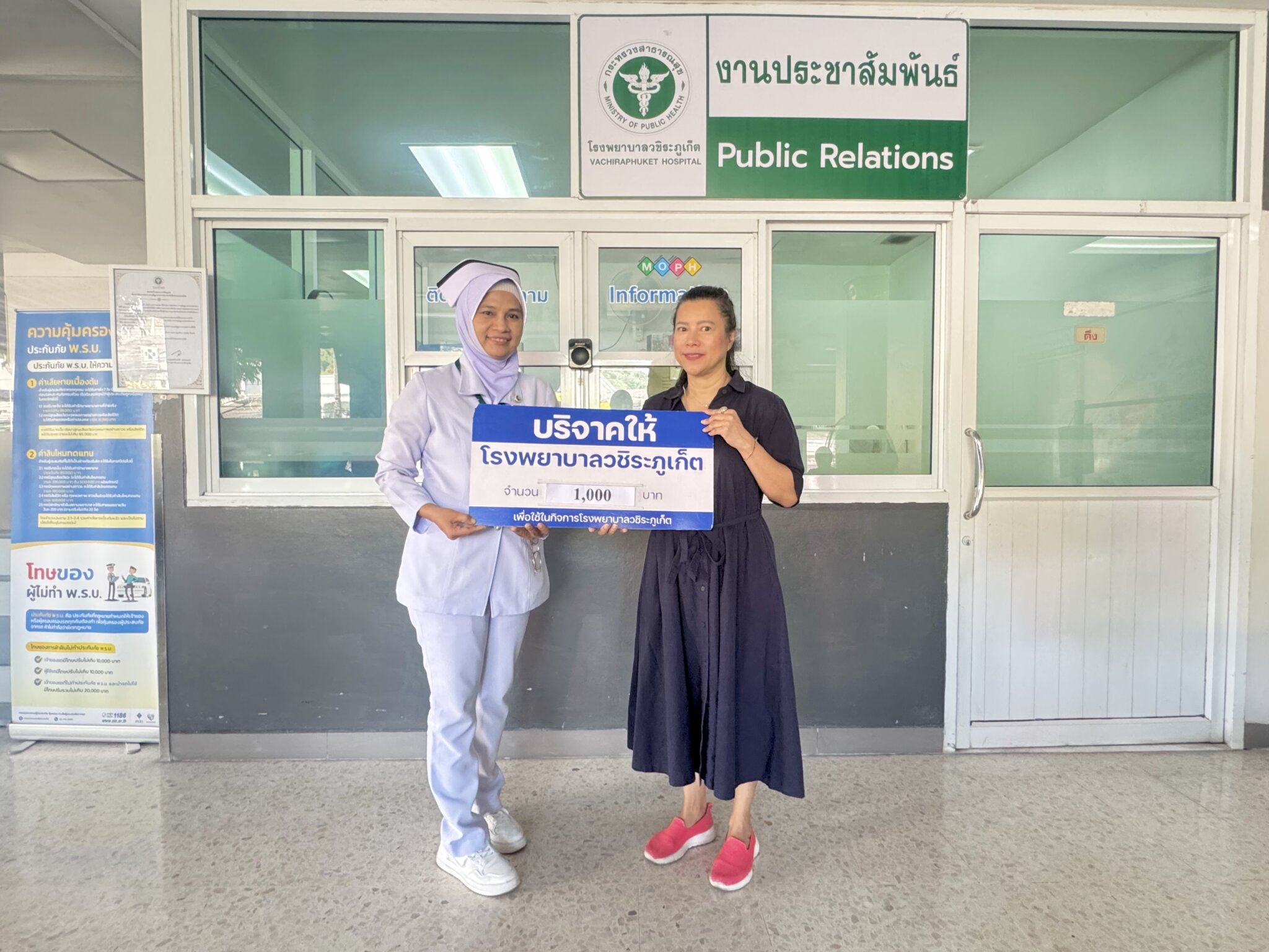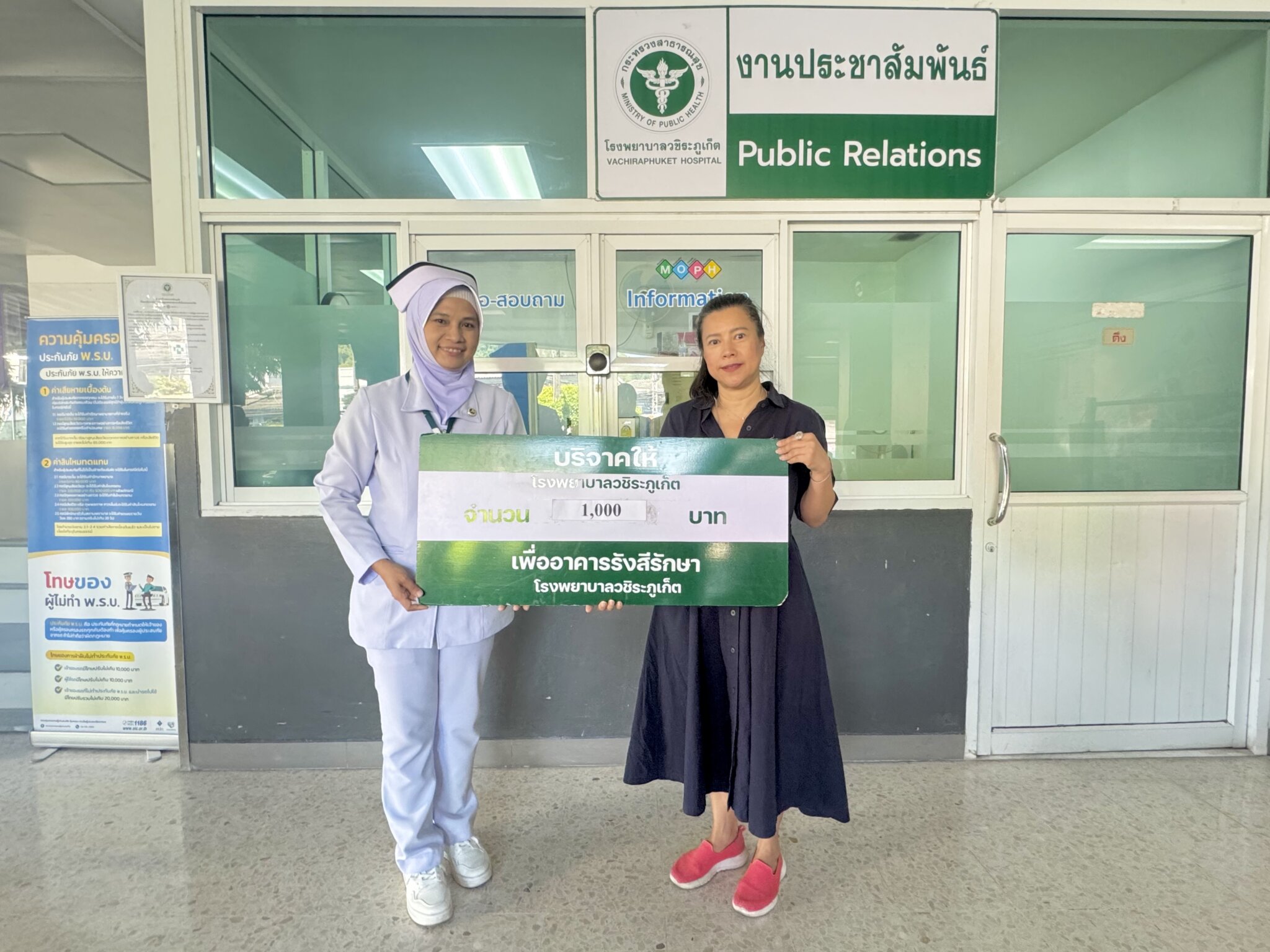 16 มีนาคม 2569 Madame Phuket Real Estate บริจาคเงิน 1,000 บาท เพื่อสมทบทุนจัดซื้อเครื่องมือแพทย์ “อาคารรังสีรักษา” ศูนย์มะเร็งครบวงจร และบริจาคเพิ่มเติมอีก 1,000 บาท เพื่อใช้ในกิจการโรงพยาบาลวชิระภูเก็ต โดยมี พว.สุปราณี สร้างเมือง เป็นตัวแทนรับมอบ เป็นตัวแทนรับมอบ ณ อาคารผู้ป่วยนอก ชั้น 1 โรงพยาบาลวชิระภูเก็ต