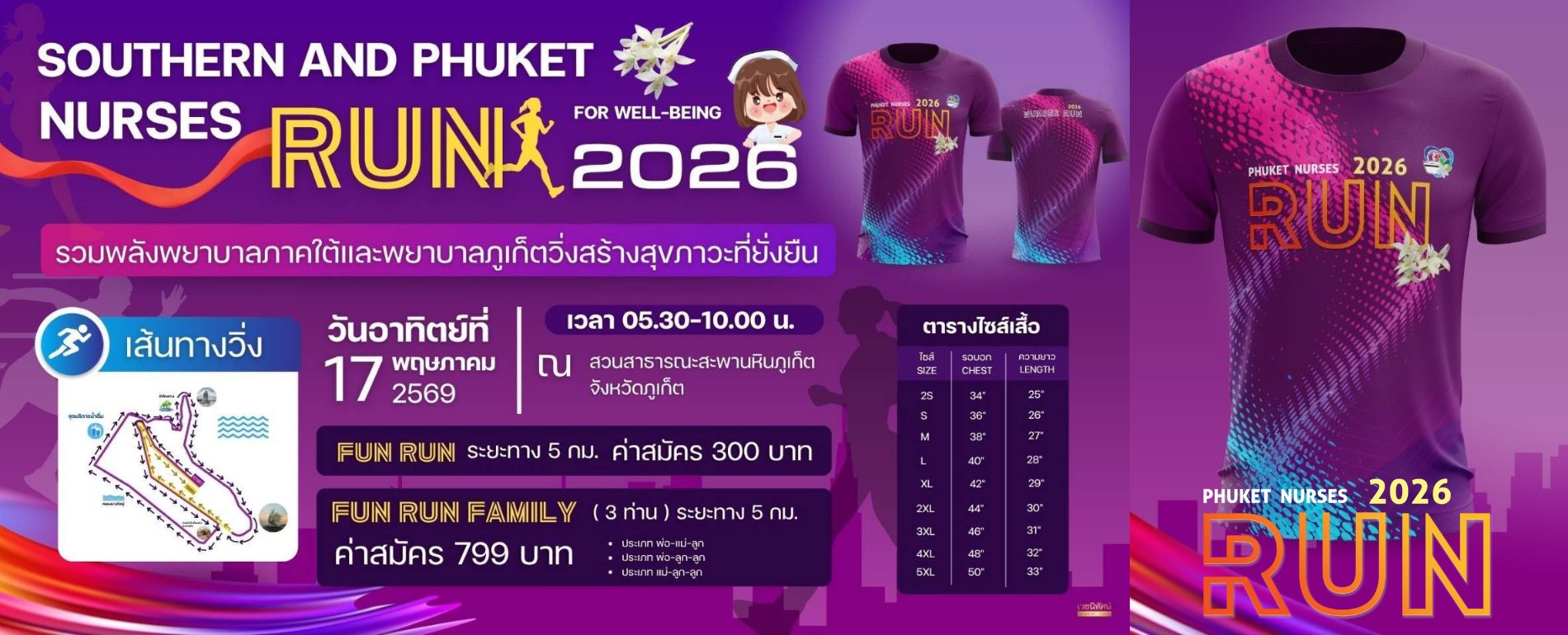 ชมรมพยาบาลจังหวัดภูเก็ต ร่วมกับสมาคมพยาบาลแห่งประเทศไทยฯ สาขาภาคใต้ ขอเชิญชวนทุกท่านร่วมกิจกรรมพยาบาลชวนวิ่งเพื่อสุขภาวะที่ดี 2026 (Southern and Phuket Nurses Run for Well-Being 2026) ครั้งที่ 4 เนื่องในวันพยาบาลสากล ประจำปี 2569 เพื่อรวมพลังพยาบาลภาคใต้และพยาบาลจังหวัดภูเก็ต ในการวิ่งสร้างสุขภาวะที่ยั่งยืน โดยมีวัตถุประสงค์เพื่อมุ่งเน้นการส่งเสริมสุขภาพและสร้างความตระหนักรู้ความสำคัญของการดูแลสุขภาพอย่างต่อเนื่องและยั่งยืนของพยาบาล ประชาชน และครอบครัวโดยการออกกำลังกายด้วยการเดิน-วิ่ง