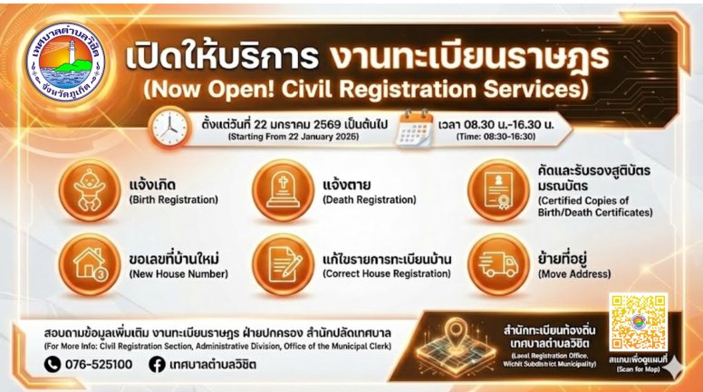 เปิดให้บริการแล้ว สำหรับงานทะเบียนราษฎร เทศบาลตำบลวิชิต โดยเปิดให้บริการตั้งแต่วันที่ 22 มกราคม 2569 เป็นต้นไป