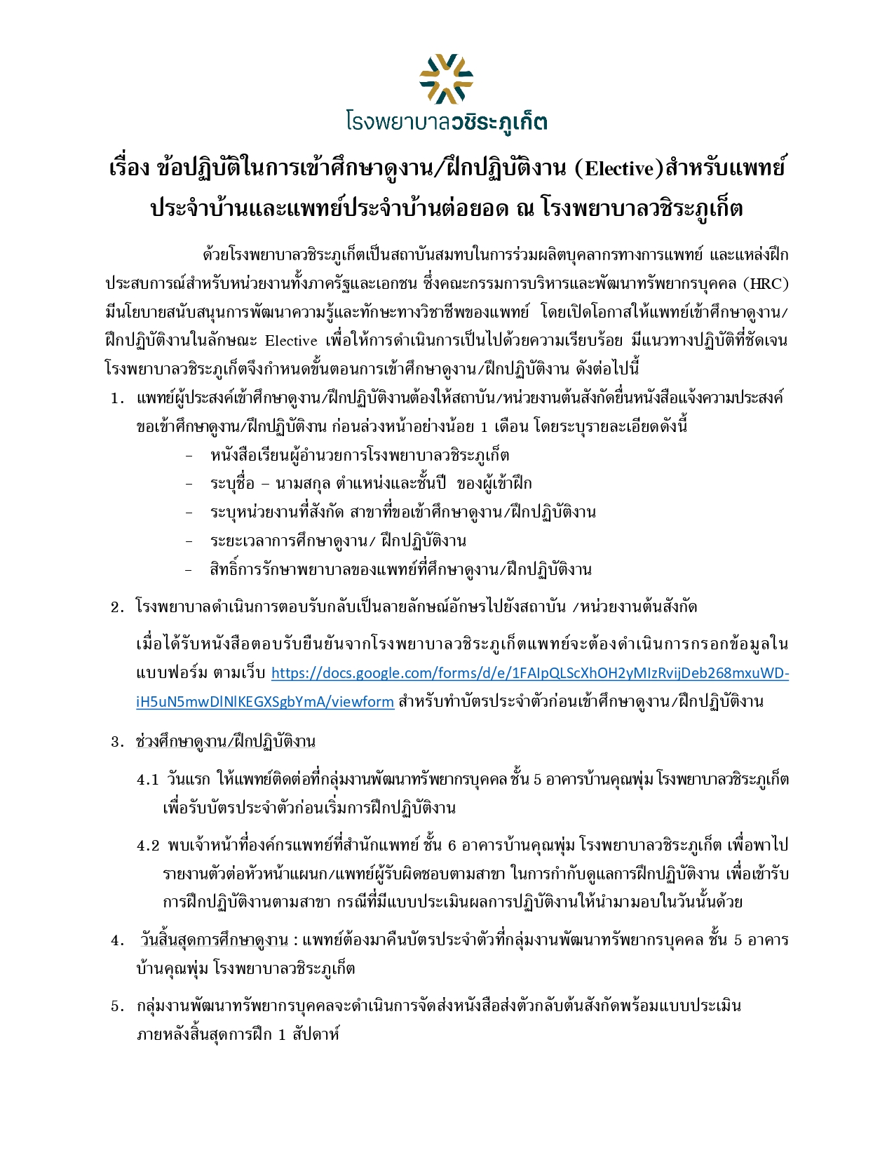 เรื่อง ข้อปฏิบัติในการเข้าศึกษาดูงาน/ฝึกปฏิบัติงาน (Elective) สำหรับแพทย์ประจำบ้านและแพทย์ประจำบ้านต่อยอด ณ โรงพยาบาลวชิระภูเก็ต