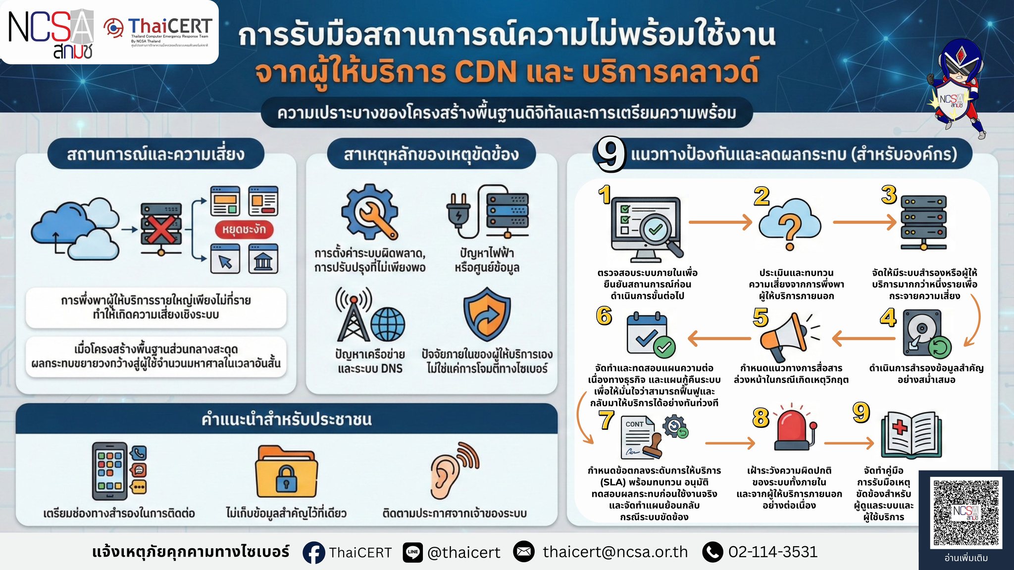 ThaiCERT ได้ติดตามและพบเหตุการณ์ขัดข้องของผู้ให้บริการโครงสร้างพื้นฐานดิจิทัลรายใหญ่ระดับโลก (เช่น ระบบ CDN และ Cloud Service) เกิดขึ้นอย่างต่อเนื่อง ซึ่งส่งผลกระทบให้เว็บไซต์ แพลตฟอร์มออนไลน์ และระบบงานสำคัญหลายแห่งไม่สามารถให้บริการได้ชั่วคราว