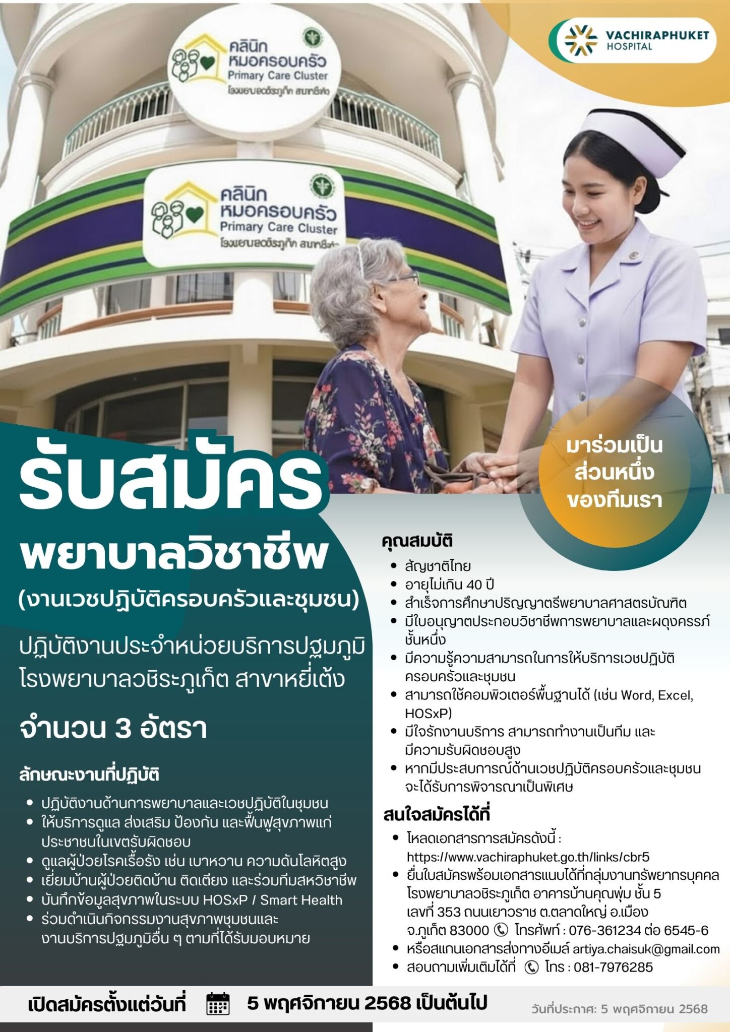 หน่วยบริการปฐมภูมิ โรงพยาบาลวชิระภูเก็ต สาขาหยี่เต้ง รับสมัครพยาบาลวิชาชีพ (งานเวชปฏิบัติครอบครัวและชุมชน) 3 อัตรา