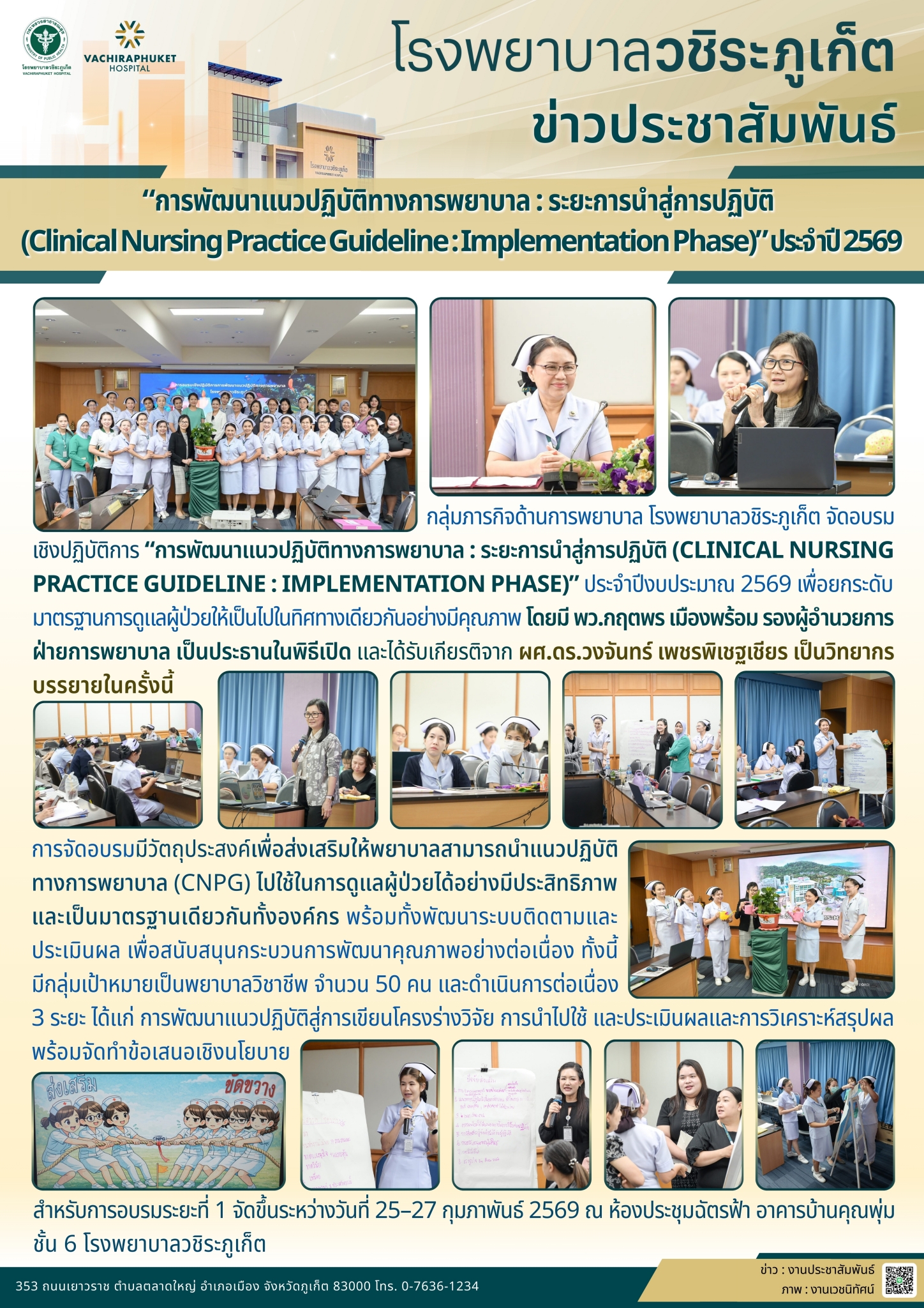 “การพัฒนาแนวปฏิบัติทางการพยาบาล : ระยะการนำสู่การปฏิบัติ (Clinical Nursing Practice Guideline : Implementation Phase)” ประจำปี 2569 อภิญญา เอ่งฉ้วน2026-02-27T14:55:38+07:0027 กุมภาพันธ์ 2026|Categories: ข่าวประชาสัมพันธ์|Tags: hrd-act| View Larger Image ปรับปรุงเมื่อ 2 ชั่วโมง ago เข้าชม: 21 ลิงค์สำหรับนำไปเผยแพร่: https://www.vachiraphuket.go.th/links/40yt แบ่งปันเรื่องนี้ FacebookXTelegramEmail