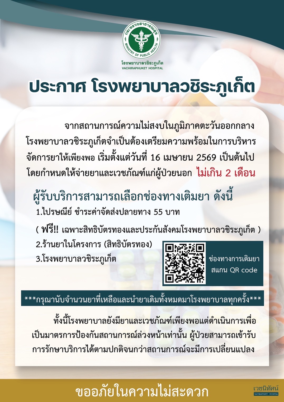 ประกาศ โรงพยาบาลวชิระภูเก็ต อภิญญา เอ่งฉ้วน2026-04-15T23:46:29+07:0015 เมษายน 2026|Categories: ข่าวประชาสัมพันธ์| View Larger Image ปรับปรุงเมื่อ 4 ชั่วโมง ago เข้าชม: 120 ลิงค์สำหรับนำไปเผยแพร่: https://www.vachiraphuket.go.th/rity แบ่งปันเรื่องนี้ FacebookXTelegramEmail