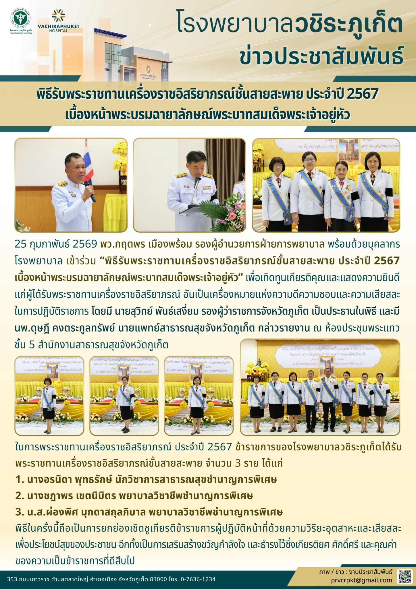 พิธีรับพระราชทานเครื่องราชอิสริยาภรณ์ชั้นสายสะพาย ประจำปี 2567 เบื้องหน้าพระบรมฉายาลักษณ์พระบาทสมเด็จพระเจ้าอยู่หัว ดารัตน์ ภิญโญ2026-02-25T16:49:21+07:0025 กุมภาพันธ์ 2026|Categories: ข่าวประชาสัมพันธ์| View Larger Image ปรับปรุงเมื่อ 12 ชั่วโมง ago เข้าชม: 37 ลิงค์สำหรับนำไปเผยแพร่: https://www.vachiraphuket.go.th/9o0l แบ่งปันเรื่องนี้ FacebookXTelegramEmail