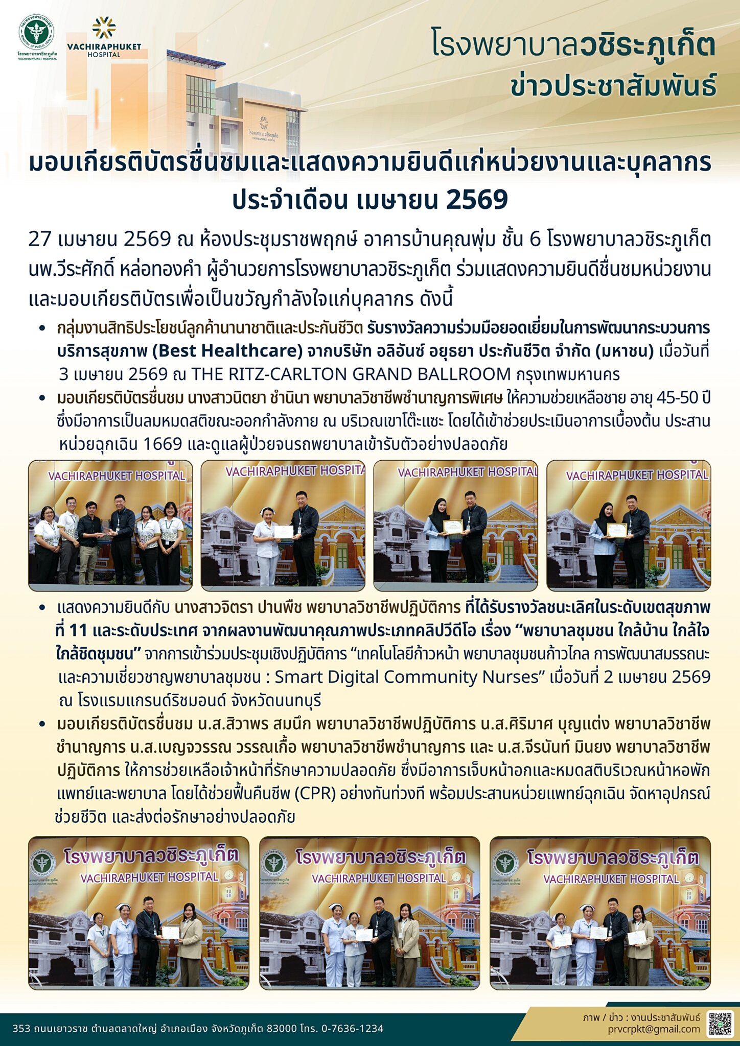 มอบเกียรติบัตรชื่นชมและแสดงความยินดีแก่หน่วยงานและบุคลากร ประจำเดือน เมษายน 2569 อภิญญา เอ่งฉ้วน2026-04-27T21:52:30+07:0027 เมษายน 2026|Categories: ข่าวประชาสัมพันธ์|Tags: hrd-act| View Larger Image ปรับปรุงเมื่อ 22 ชั่วโมง ago เข้าชม: 67 ลิงค์สำหรับนำไปเผยแพร่: https://www.vachiraphuket.go.th/go/2i2q แบ่งปันเรื่องนี้ FacebookXTelegramEmail