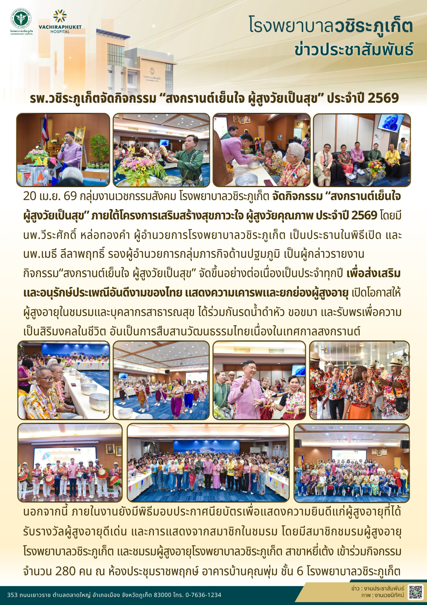 รพ.วชิระภูเก็ตจัดกิจกรรม “สงกรานต์เย็นใจ ผู้สูงวัยเป็นสุข” ประจำปี 2569 อภิญญา เอ่งฉ้วน2026-04-21T22:36:12+07:0021 เมษายน 2026|Categories: ข่าวประชาสัมพันธ์| View Larger Image ปรับปรุงเมื่อ 17 ชั่วโมง ago เข้าชม: 101 ลิงค์สำหรับนำไปเผยแพร่: https://www.vachiraphuket.go.th/ng8s แบ่งปันเรื่องนี้ FacebookXTelegramEmail