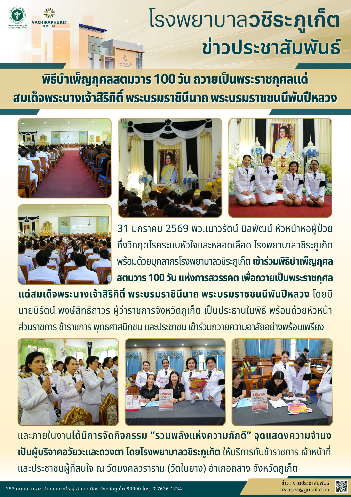 รพ.วชิระภูเก็ต ร่วมพิธีบำเพ็ญกุศลสตมวาร 100 วัน ถวายเป็นพระราชกุศลแด่ สมเด็จพระนางเจ้าสิริกิติ์ พระบรมราชินีนาถ พระบรมราชชนนีพันปีหลวง อภิญญา เอ่งฉ้วน2026-02-01T11:07:04+07:001 กุมภาพันธ์ 2026|Categories: ข่าวประชาสัมพันธ์| View Larger Image ปรับปรุงเมื่อ 6 ชั่วโมง ago เข้าชม: 23 ลิงค์สำหรับนำไปเผยแพร่: https://www.vachiraphuket.go.th/links/3i2k แบ่งปันเรื่องนี้ FacebookXTelegramEmail