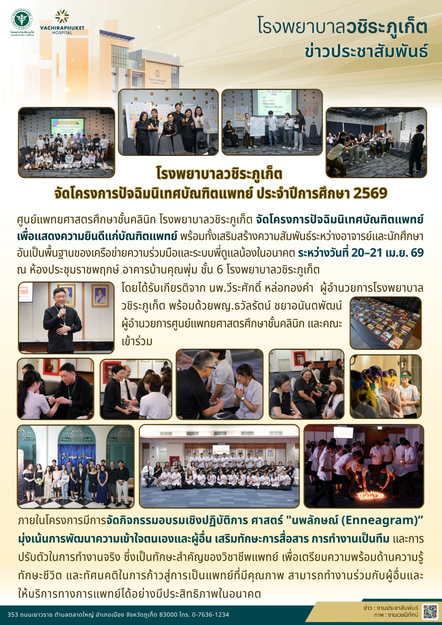 โครงการปัจฉิมนิเทศบัณฑิตแพทย์ ประจำปีการศึกษา 2569 อภิญญา เอ่งฉ้วน2026-04-23T21:40:11+07:0023 เมษายน 2026|Categories: ข่าวประชาสัมพันธ์| View Larger Image ปรับปรุงเมื่อ 7 ชั่วโมง ago เข้าชม: 29 ลิงค์สำหรับนำไปเผยแพร่: https://www.vachiraphuket.go.th/go/pxf9 แบ่งปันเรื่องนี้ FacebookXTelegramEmail
