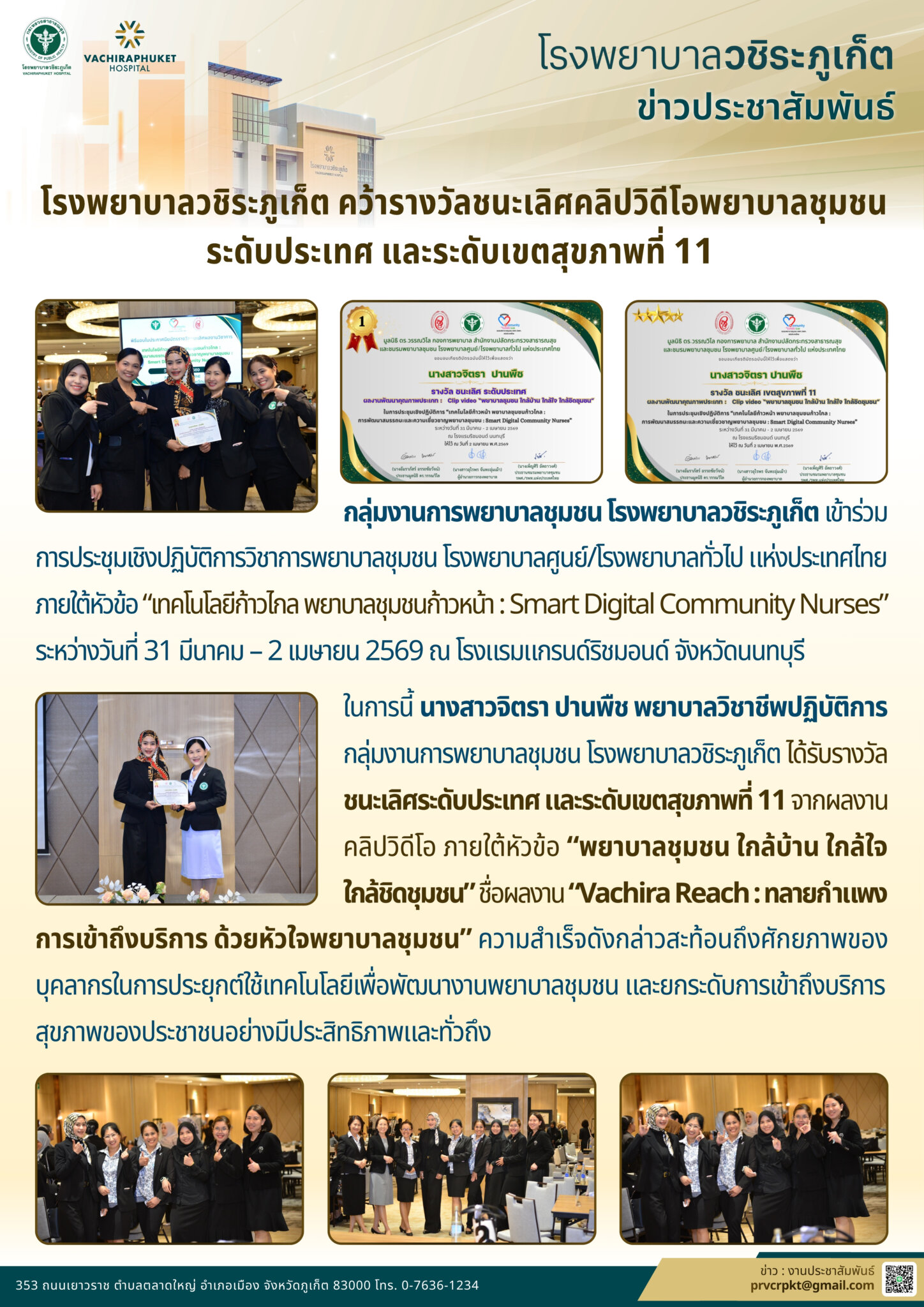 ในการนี้ นางสาวจิตรา ปานพืช พยาบาลวิชาชีพปฏิบัติการ กลุ่มงานการพยาบาลชุมชน โรงพยาบาลวชิระภูเก็ต ได้รับรางวัลชนะเลิศ ระดับประเทศ และเขตสุขภาพที่ 11 จากผลงานคลิปวิดีโอ ภายใต้หัวข้อ “พยาบาลชุมชน ใกล้บ้าน ใกล้ใจ ใกล้ชิดชุมชน “ชื่อผลงาน“ Vachira Reach : ทลายกำแพงการเข้าถึงบริการ ด้วยหัวใจพยาบาลชุมชน”