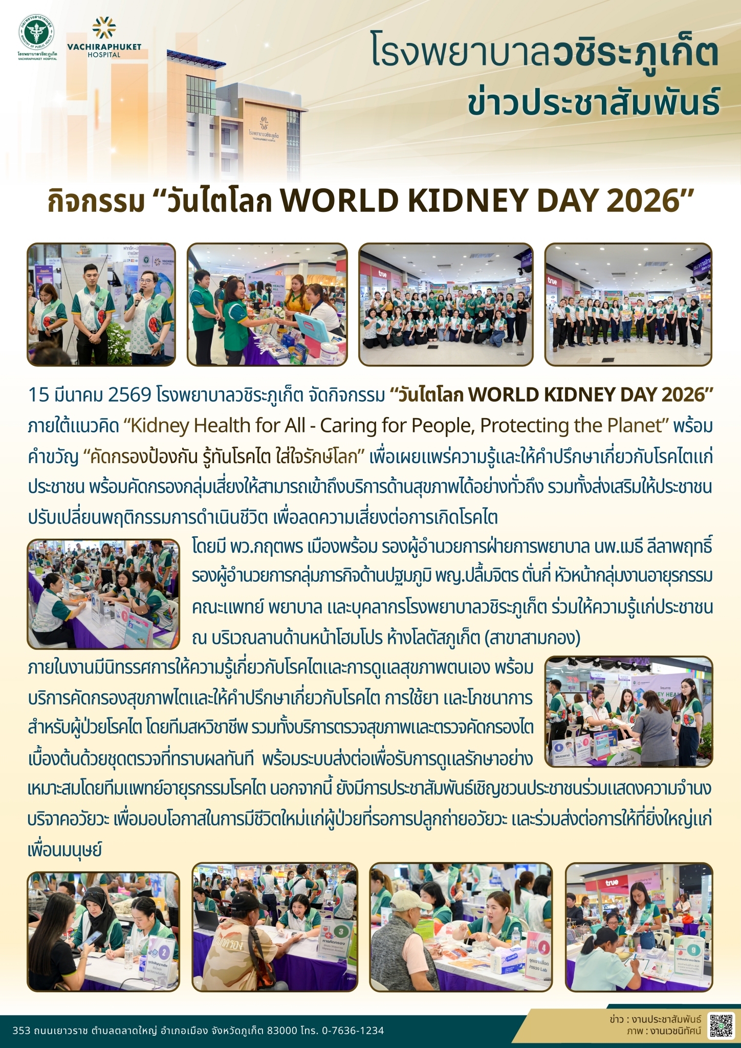 โรงพยาบาลวชิระภูเก็ต จัดกิจกรรม “วันไตโลก WORLD KIDNEY DAY 2026” ดารัตน์ ภิญโญ2026-03-15T18:08:28+07:0015 มีนาคม 2026|Categories: ข่าวประชาสัมพันธ์| View Larger Image ปรับปรุงเมื่อ 3 ชั่วโมง ago เข้าชม: 66 ลิงค์สำหรับนำไปเผยแพร่: https://www.vachiraphuket.go.th/links/wplr แบ่งปันเรื่องนี้ FacebookXTelegramEmail