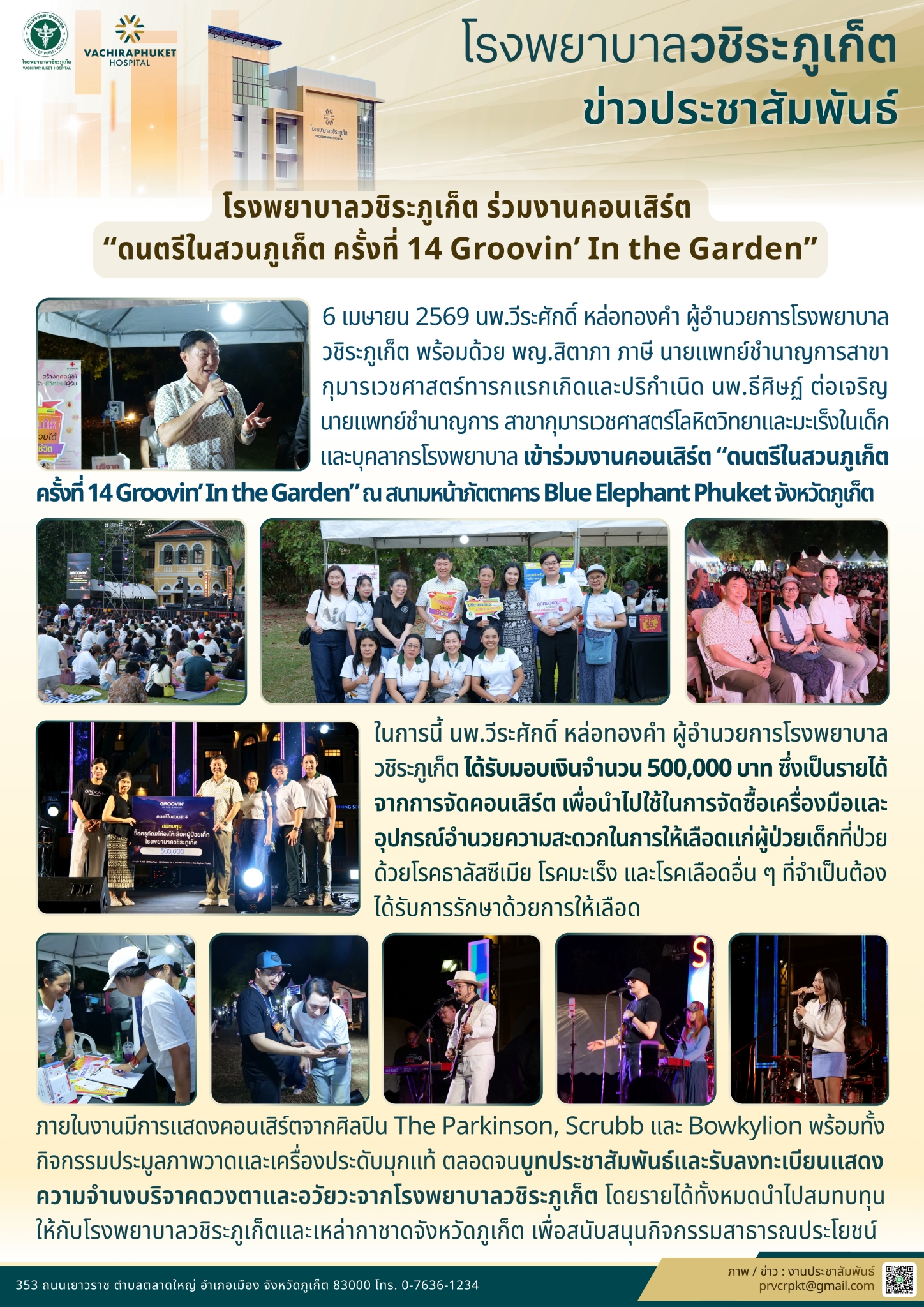 โรงพยาบาลวชิระภูเก็ต ร่วมงานคอนเสิร์ต “ดนตรีในสวนภูเก็ต ครั้งที่ 14 Groovin’ In the Garden” อภิญญา เอ่งฉ้วน2026-04-07T15:55:51+07:007 เมษายน 2026|Categories: ข่าวบริจาค, ข่าวประชาสัมพันธ์| View Larger Image ปรับปรุงเมื่อ 7 ชั่วโมง ago เข้าชม: 41 ลิงค์สำหรับนำไปเผยแพร่: https://www.vachiraphuket.go.th/go/meh3 แบ่งปันเรื่องนี้ FacebookXTelegramEmail