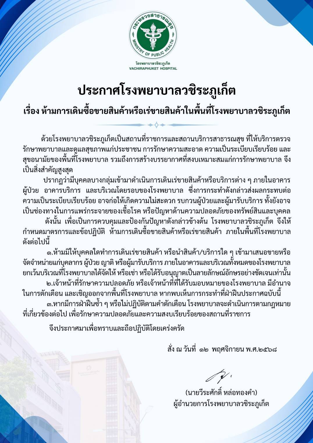 เรื่อง ห้ามการเดินซื้อขายสินค้าหรือเร่ขายสินค้าในพื้นที่โรงพยาบาลวชิระภูเก็ต