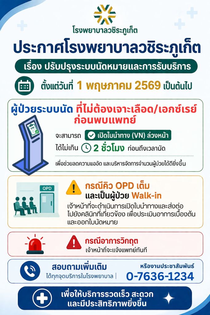 📢 ประกาศโรงพยาบาลวชิระภูเก็ต เรื่อง ปรับปรุงระบบนัดหมายและการรับบริการ