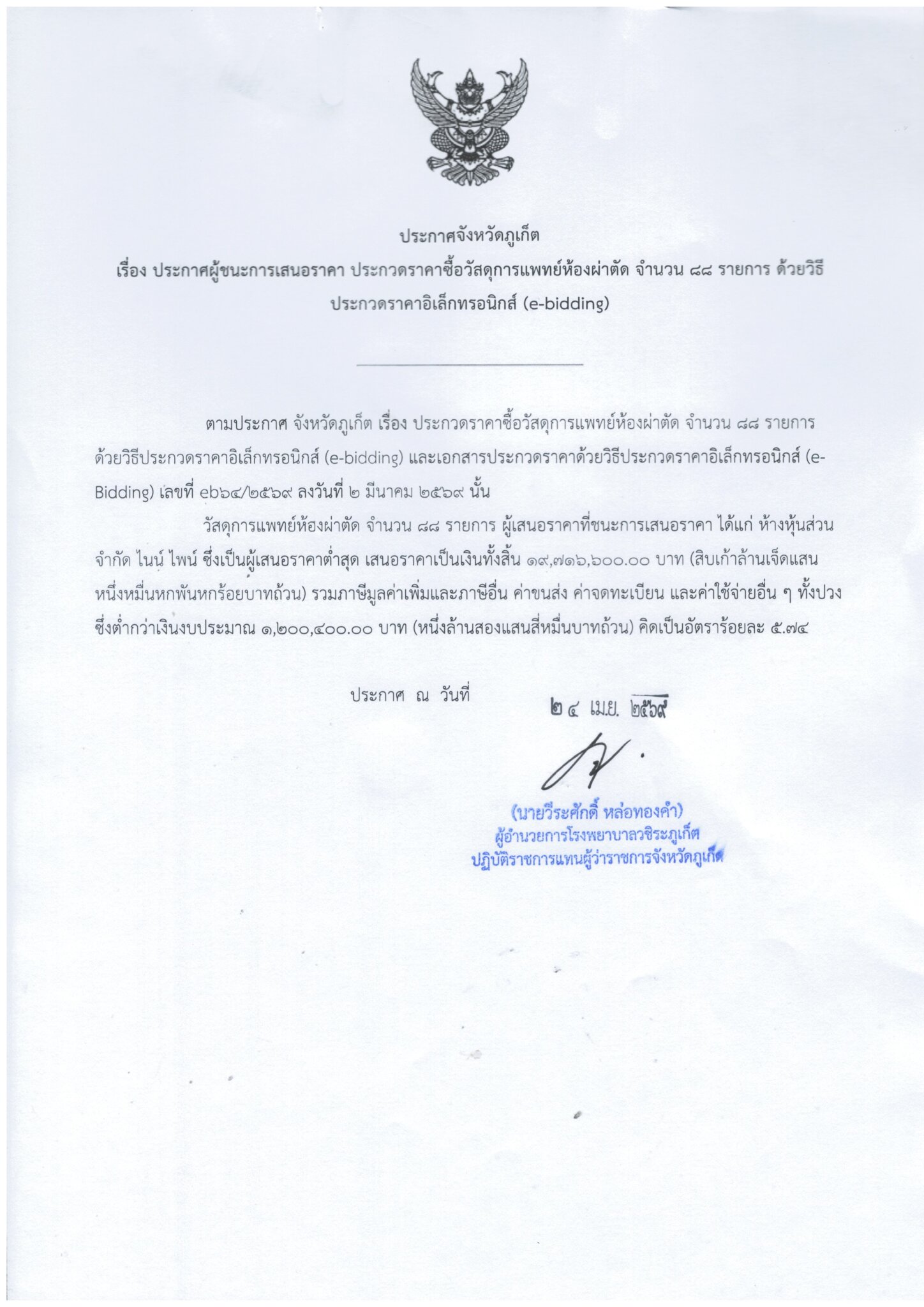 ตามประกาศ จังหวัดภูเก็ต เรื่อง ประกวดราคาซื้อประกาศผู้ชนะการเสนอราคาซื้อวัสดุการแพทย์ห้องผ่าตัด จำนวน ๘๘ รายการ ด้วยวิธีประกวดราคาอิเล็กทรอนิกส์ (e-bidding) และเอกสารประกวดราคาด้วยวิธีประกวดราคาอิเล็กทรอนิกส์ (e-bidding) เลขที่ eb๖๔/๒๕๖๙ ลงวันที่ ๒ มีนาคม ๒๕๖๙ นั้น