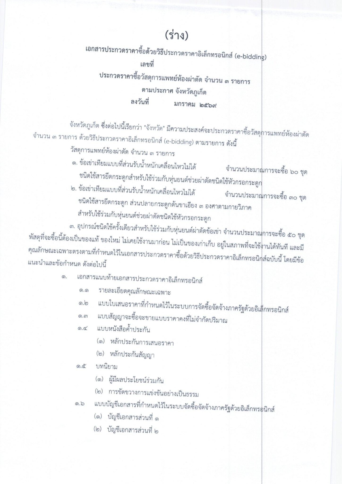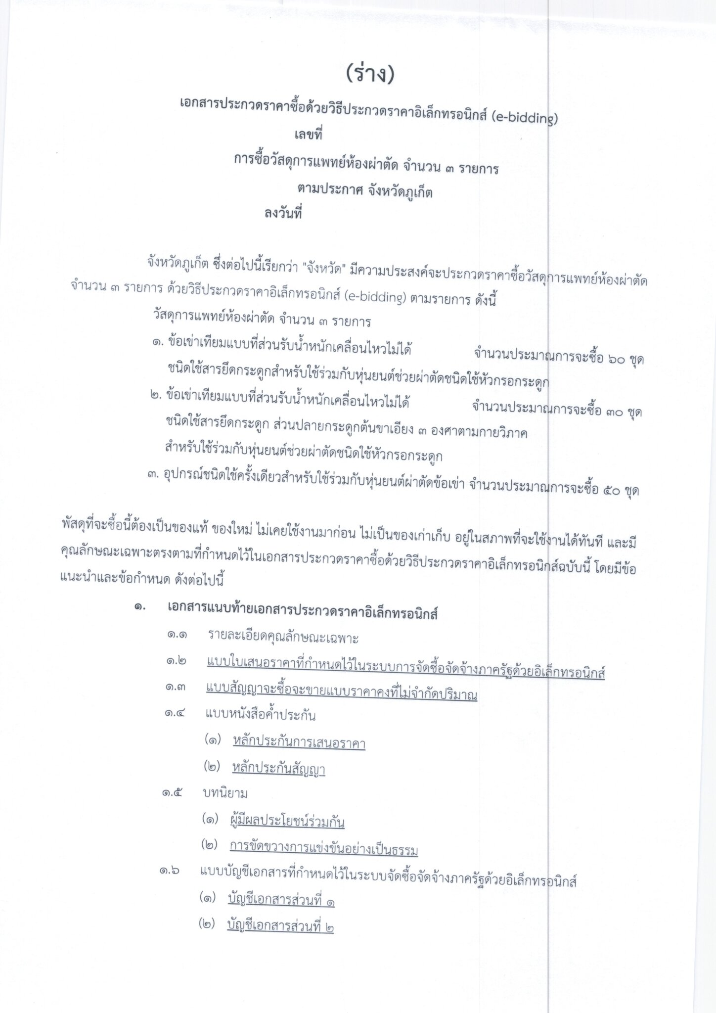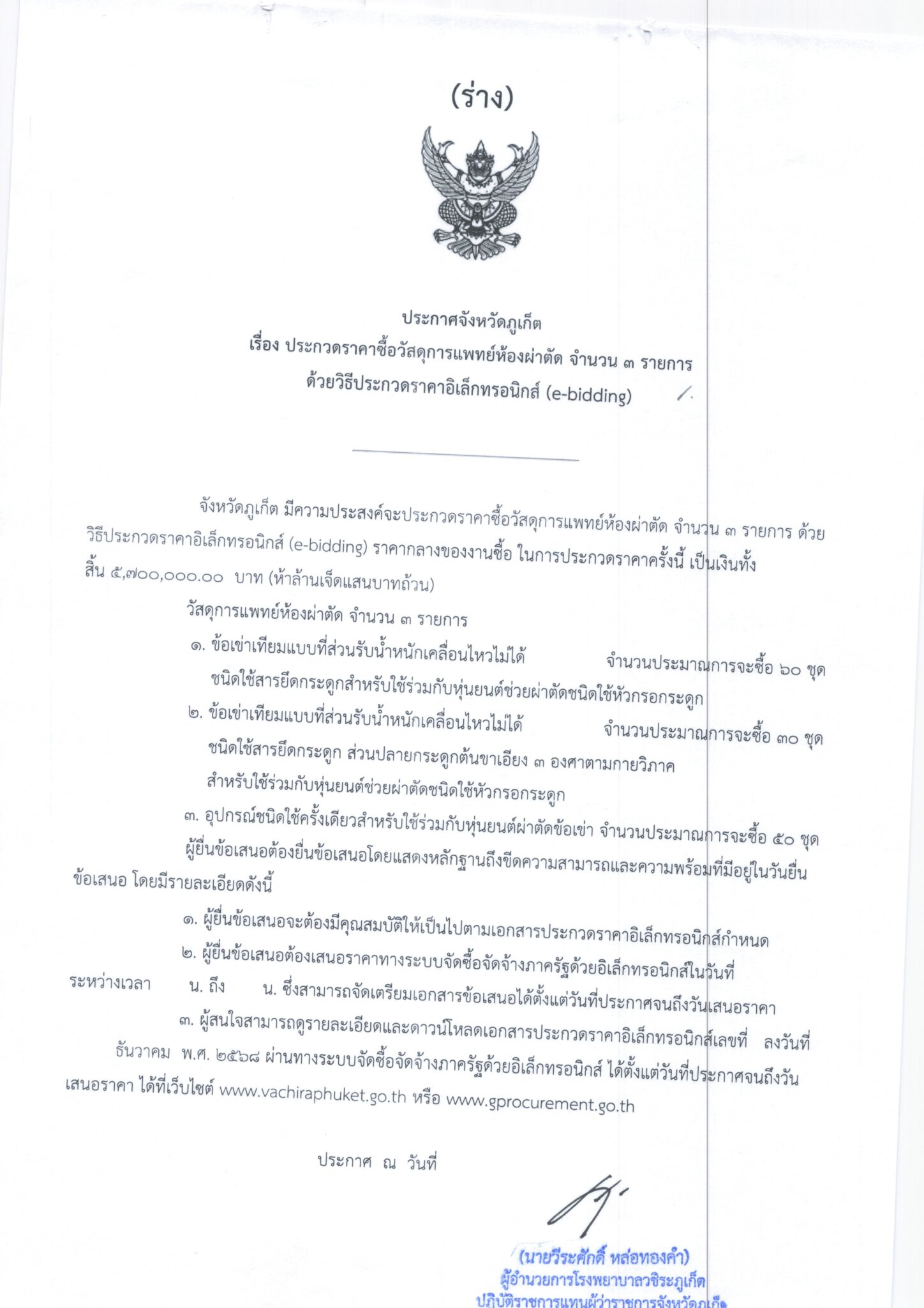 จังหวัดภูเก็ต มีความประสงค์จะประกวดราคาซื้อครุภัณฑ์การแพทย์ จำนวน ๓ รายการ ด้วยวิธีประกวดราคาอิเล็กทรอนิกส์ (e-bidding) ราคากลางของงานซื้อในการประกวดราคาครั้งนี้ เป้นเงินทั้งสิ้น ๕,๗๐๐,๐๐๐.๐๐ บาท (ห้าล้านเจ็ดแสนบาทถ้วน)